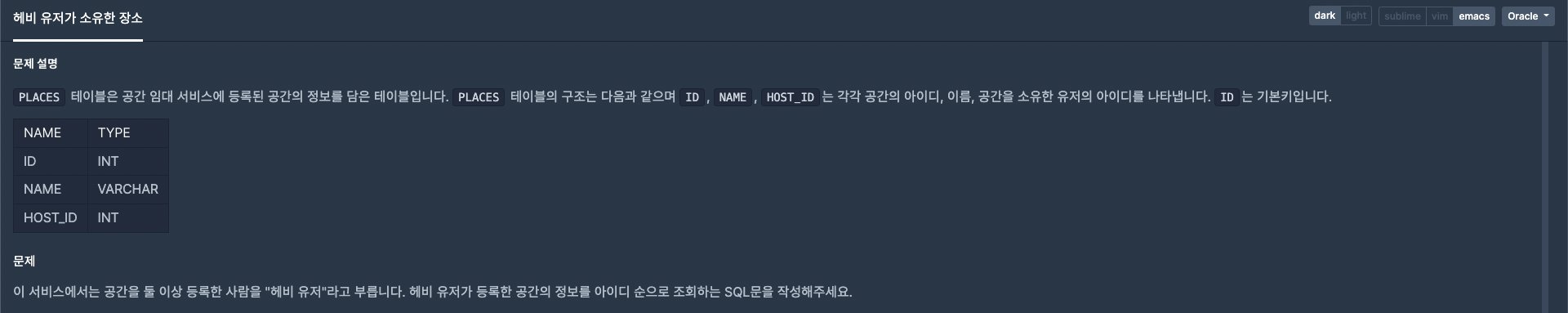 PLACES 테이블은 공간 임대 서비스에 등록된 공간의 정보를 담은 테이블입니다. PLACES 테이블의 구조는 다음과 같으며 ID, NAME, HOST_ID는 각각 공간의 아이디, 이름, 공간을 소유한 유저의 아이디를