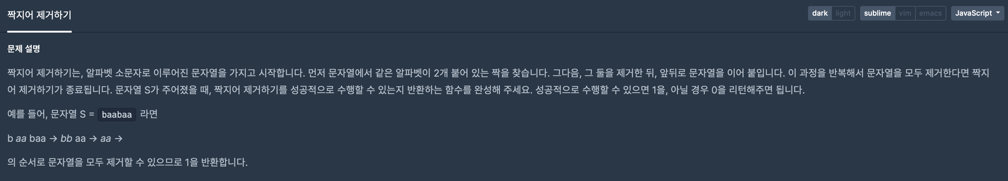 - https://programmers.co.kr/learn/courses/30/lessons/12973?language=javascript