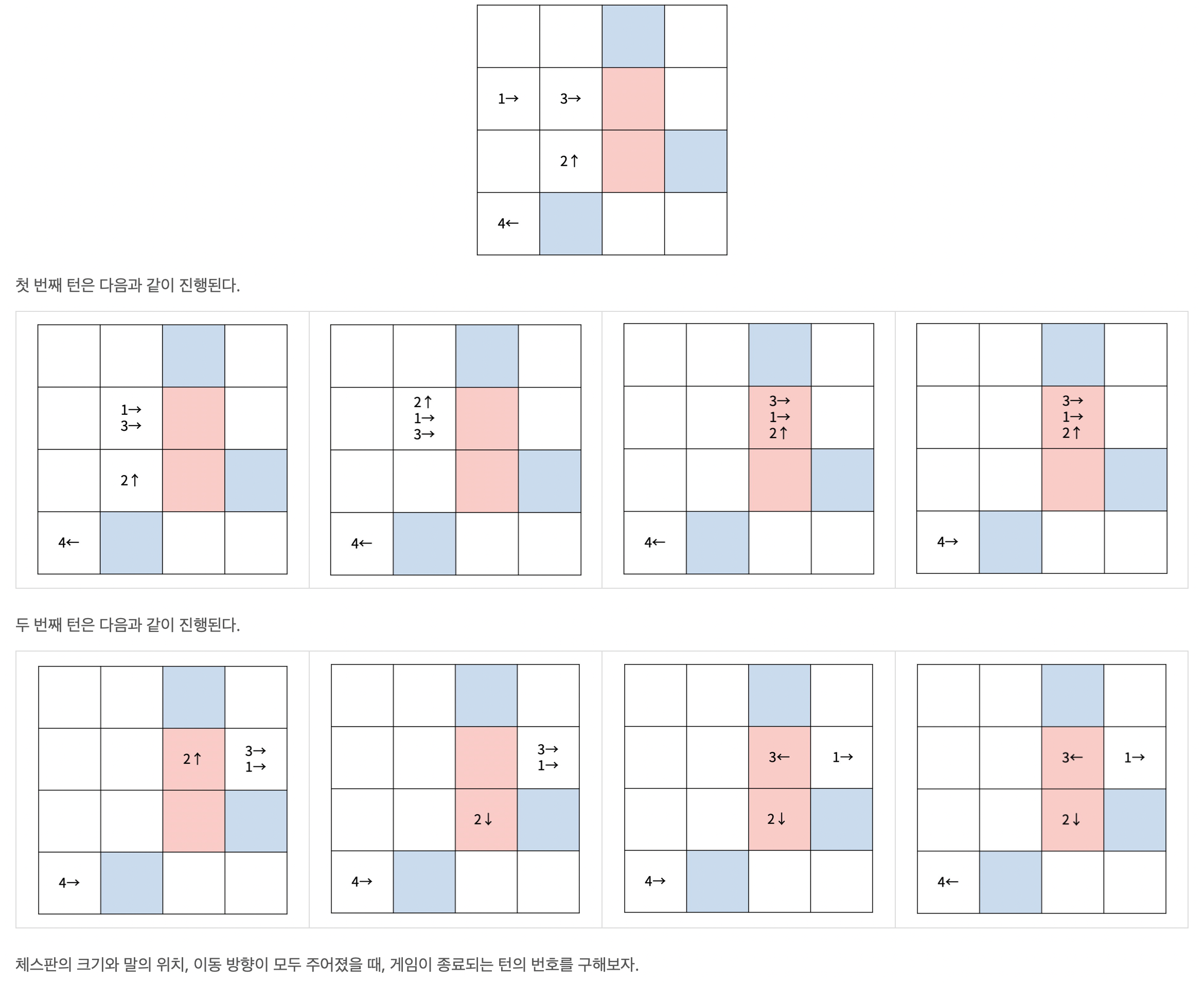 그리고 각 말별로 어느 좌표, 어느 진행 방향을 갖고 있는지 확인을 위해 딕셔너리를 이용하였습니다.
